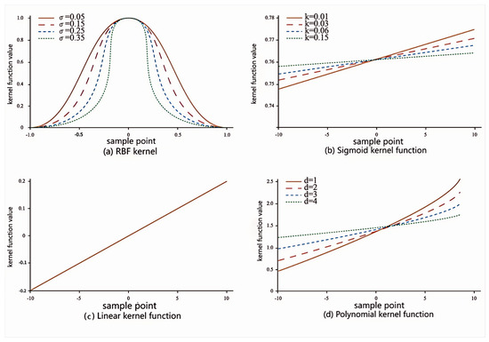Four kinds of kernel function curve graphs are shown in Figure 9. The analysis of the data should be based on the characteristics of the data themselves to choose the appropriate kernel function, so this paper adopted the linear multi-kernel function. In Figure 9, is the hyperparameter of the radial basis kernel and d is the number of highest terms in the polynomial kernel function, which defaulted to 3.