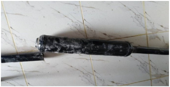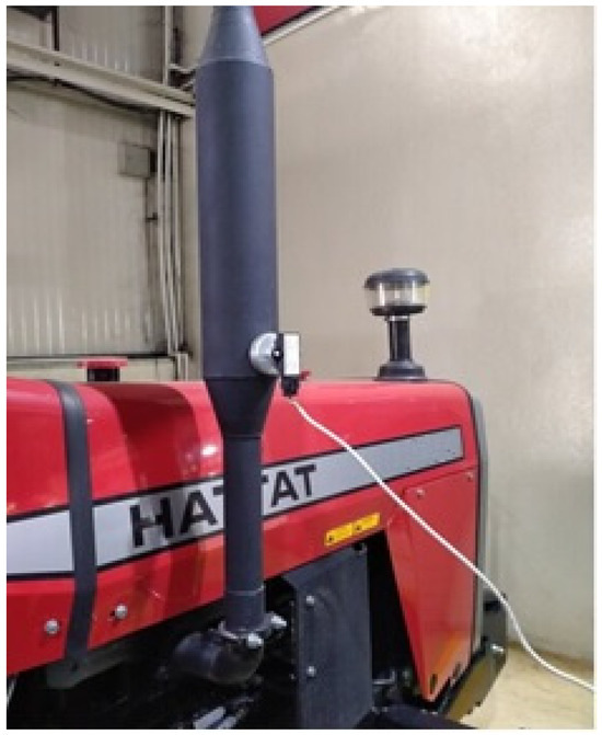 Vibration measurements were conducted using accelerometer sensors placed on the vertical exhaust system of the tractor. The data obtained from the sensors were recorded for 60 s in the 0–200 Hz frequency range. According to previous studies and based on the excitation of the exhaust system, the most important modes to induce vibration and consider are between 20 Hz and 200 Hz [31]. This frequency range is a typical range where vibrations in tractor exhaust systems are observed. The location of the sensors on the exhaust is shown in Figure 13. Differences in stiffness across various sections of the exhaust system can lead to the emergence of multiple modes and uncertain vibration patterns. Since this situation complicates vibration analysis, a sensor was placed near the fracture point, which is the most critical region and where vibrations are most intense, to conduct measurements. This allowed for a clearer identification of the vibration source. The obtained data provided detailed information about the magnitude, frequency, and distribution of vibrations in the exhaust system.