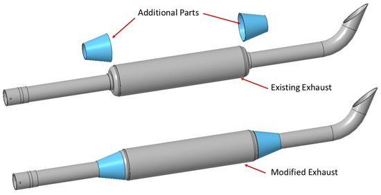 Modal analysis methods of vibrating structures include test modal analysis and finite element modal analysis [21,22]. Modal testing is usually used to verify the accuracy of finite element analysis. Considering the economy and accuracy of test analysis, how to determine the optimization object and design plan is always an important issue. Before the finite element model is updated, a modal test is performed to extract the modal parameters from the real structure [23]. The modal test is an important step in the updating process of the finite element model. Sometimes, researchers and engineers encounter difficulties in directly drawing the model in finite element analysis software due to the complexity of the structure’s geometry. There are many studies in the literature that report such an approach. In these studies, exhaust systems were modeled using CATIA V-5 software and transferred to finite element analysis software [24,25]. Fouzi et al. [26] aimed to perform finite element modeling of the exhaust structure and use a model updating approach to improve its dynamic behavior. Xu et al. [27] analyzed the vibration characteristics of an automobile exhaust system using finite element software. Vibration mode diagrams were obtained in three different ways: natural, partially constrained, and fully constrained.