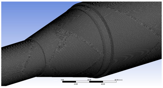 The creation of the mesh structure, a crucial step in finite element analysis, is among the factors affecting the accuracy of the solution. In this study, the mesh structure of the exhaust system was created in the ANSYS Workbench environment and the solution parameters were defined (Figure 7). The mesh structure of the model consists of 514,382 elements and 1,018,427 nodes. Meshing of the models was carried out with the free method. The free mesh method allowed the software to automate element generation, significantly speeding up the modeling phase.