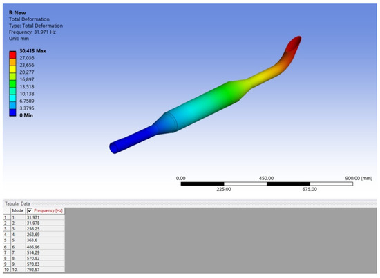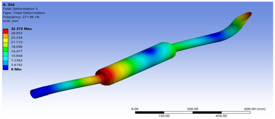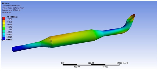 The modal analysis results obtained from ANSYS indicated that the maximum deformation occurred at the fifth mode in the outlet section of the exhaust pipe, and this area was found to be the most prone to fracture (Figure 11). In ANSYS, red represents the maximum deformation, while blue represents the minimum deformation. The measured deformation of 32.573 mm in this area revealed the weakness in this region of the exhaust system. As a result of the improvements made by changing the geometry of the last part of the exhaust pipe and adding additional supports, an increase in the natural frequency of the fifth mode was observed, and the total deformation in the fracture area was reduced by approximately 92% (Figure 12). Geometric modifications are design changes implemented to enhance system performance. However, these enhancements typically lead to increased system weight and cost. The design modifications implemented in this study resulted in a 13%(580 g) increase in part weight and a 5%(USD 1.5) increase in cost. Despite this minor weight gain, the system’s vibration characteristics were significantly enhanced. A performance evaluation of the existing exhaust system revealed a total of 35 product returns from the field. The implemented improvements shifted the exhaust system’s natural frequency away from the hazardous range, thereby increasing the system’s durability and extending its lifespan, ultimately enhancing reliability. Consequently, customer complaints related to fractures were entirely eliminated, and return rates decreased to zero. These findings confirm the accuracy and effectiveness of the conducted analyses and implemented improvement processes.