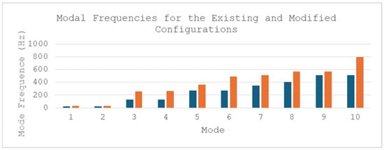 Excessive vibrations observed in the exhaust system were caused by resonance, which occurred when the forces generated during engine operation and external influences from road conditions were close to the system’s natural frequencies. This condition resulted in excessive deformations and potential fractures in certain areas of the exhaust system. Design modifications made to solve the problem increased the system’s natural frequencies, reducing the likelihood of resonance. As a result, the exhaust system became more resistant to external forces. The modal analysis results presented in Table 3 and Table 4 and Figure 8 demonstrate the successful implementation of the design changes and significant improvements in the system’s vibration behavior. These comparisons at different frequency ranges have contributed to a better understanding of the exhaust system’s dynamic behavior and enabled the development of more effective solutions for future designs.