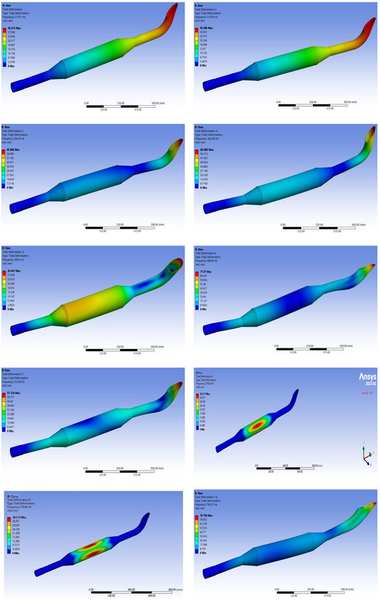 The primary objective of our study was to adjust the exhaust system’s natural frequencies to the desired level and thereby eliminate vibration-related problems. Figure 10 visually presents the first ten vibration modes of the exhaust system according to the modal analysis results. Deformations shown in different colors reveal different levels of deformation in different parts of the system. Red areas represent maximum deformation, while blue areas represent minimum deformation. These visualizations have been valuable tools both in diagnosing the problem and in making design improvements.