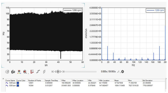 The vibration measurement graphs depicted in Figure 14 and Figure 15 provide a detailed analysis of the time-varying vibration characteristics and frequency spectra of the original and modified exhaust systems operating at 1200 rpm. Taking measurements at 1200 rpm engine speed was preferred because it is in a speed range in which tractors are frequently operated, and data appropriate to real operating conditions were obtained. The modified exhaust system exhibits the emergence of new frequency components and the attenuation of certain existing ones. The peak amplitudes in Figure 14 are noticeably lower and exhibit a distinct distribution compared to Figure 15, suggesting that the modified exhaust system has resulted in reduced vibration levels or altered vibration frequencies.