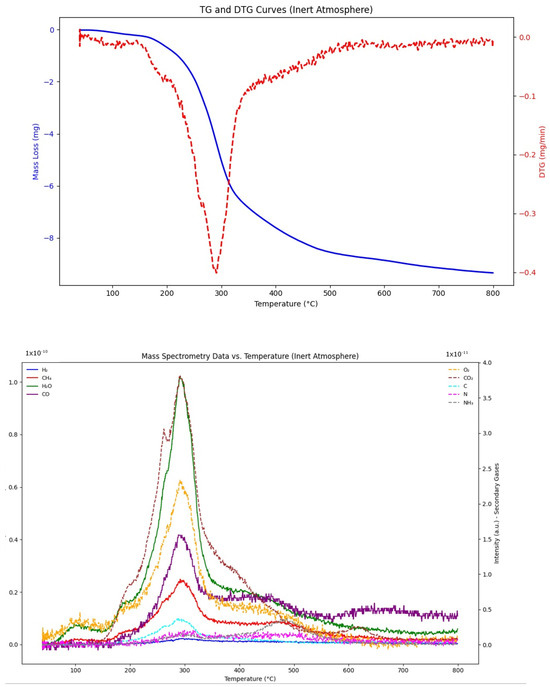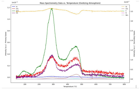 Mass spectrometry detected gases such as H2, CO, CO2, O2, CH4, and H2O. The majority of gaseous products were released between 200 and 400 °C, with H2 showing increased production at higher temperatures (~300 °C). Lower-temperature peaks (<150 °C) indicate drying and water release, which peaked at ~300 °C.