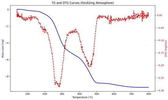 The analysis was conducted in an oxidizing atmosphere to simulate combustion conditions. The TG-DTG curves and the mass spectrometry (MS) data in Figure 3 provide a comprehensive overview of the process under the indicated conditions.