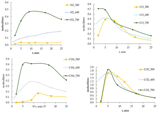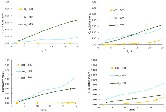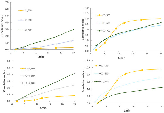 Figure 5 shows the evolution of the accumulated moles of the gases generated over time at each temperature: