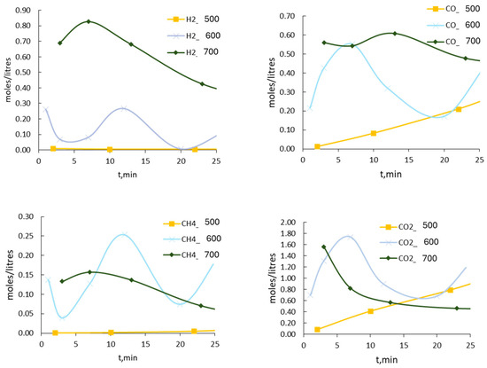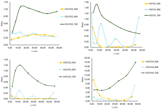 Figure 8 shows the evolution of CO/CO2, H2/CO, H2/CO2, and H2/CH4 ratios over time. At 500 °C and 600 °C, the CO/CO2 ratio remains stable at 0.2–0.3, but at 700 °C, it rises sharply above 1, indicating that reaction (2) becomes more favorable than reaction (1). At 500 °C and 600 °C, both reactions occur with equal intensity, which explains the constant ratio during the experiments. The values at 500 °C and 600 °C suggest that water–gas and water–gas shift reactions (4, 5, and 7) are not taking place, as their ratios tend to decrease over time. However, at 700 °C, an increase in both ratios are observed early in the reaction, indicating the potential involvement of these reactions, likely due to the release of moisture from the biomass.