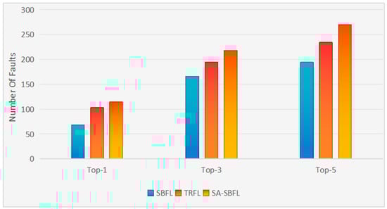 Figure 3 demonstrates the fault localization effectiveness of SA-SBFL, traditional SBFL, and TRFL on Top-N (N = 1, 3, 5) across five projects, showing the total number of faults found by each method. It is evident from the figure that SA-SBFL significantly outperforms both traditional SBFL and TRFL in terms of fault localization accuracy, regardless of whether the faulty statements are ranked first, within the top three, or the top five. SA-SBFL exhibits greater precision and reliability in all these cases. The specific localization effects of the three fault localization techniques across the five projects are presented in Table 5. For instance, in the Closure project, SA-SBFL can localize 87 faults on Top-5, which is 48 more than SBFL and 28 more than TRFL. It should also be noted that the statistical formula used by the three methods in the table is Dstar.