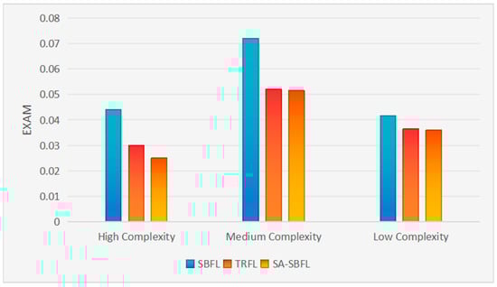 Next, let us discuss the performance of SA-SBFL across projects of different complexities. First, according to the Loc and #Tests for each project in Table 4, projects are categorized into low, medium, and high complexity. Closure is considered high complexity, Chart and Math are medium complexity, and Lang and Time are low complexity. From Figure 4, it can be observed that in projects of all complexity levels, SA-SBFL has the lowest EXAM values, while SBFL has the highest EXAM values. Particularly in high-complexity projects, SA-SBFL’s EXAM value is 0.025, which is the lowest among all the techniques. In summary, SA-SBFL demonstrates the highest fault localization accuracy across projects of varying complexities, with its advantage being particularly evident in high-complexity projects.