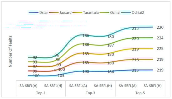 Fault localization results of SA-SBFL and SBFL using different statistical formulas.