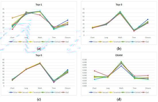 The influence of different statistical formulas on SA-SBFL on Top-1 (a), Top-3 (b), Top-5 (c), and EXAM (d).