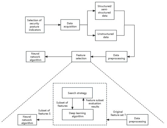 The collection of network security posture elements is the foundation for sensing and mastering the security posture [8]. Only by collecting representative and targeted data can an accurate, reliable, and scientific network security situation be constructed and generated. Considering the complex sources, numerous objects, and diverse levels of network security posture data, this paper incorporates a feature selection algorithm into element extraction, to enhance the accuracy and reliability of element collection. The element extraction method mainly includes the steps of security posture indicator selection, data acquisition, distinguishing structured/semi-structured/unstructured data, data preprocessing, feature selection, and element presentation.