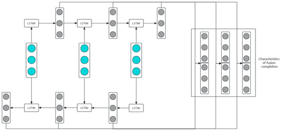 The computation of the reverse hidden state is similar to that of the forward direction, except that the computation order is reversed from the end of the sequence, and that after obtaining the direction hidden state , it is spliced with the output of the forward hidden state in the feature dimension, to obtain the final hidden state of the BiLSTM at each time step , which is used in the subsequent computation of the output layer [12,17]. The running schematic is shown in Figure 2: