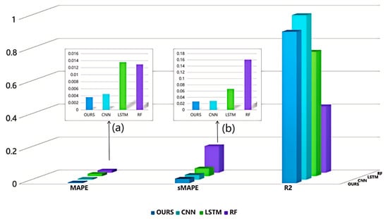 The four algorithms were trained on the basis of Section 3.2 data processing, and the preset number of training iterations were all able to make the model completely reach the final convergence state, based on which the MAPE, sMAPE, and fitting coefficients of the four models were measured, to obtain the data presented in Figure 5, which is a comparative result of the upper limit of the model performance.