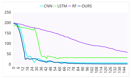 We present the following detailed training information about this model: the number of iterations refers to the number of rounds after which the model is fully trained on the entire training dataset; the IPSO-BiLSTM model in this paper has a rapid decrease in sMAPE value after about 12 iterations, and stays at a low level afterwards; it is recommended to set a large range of the number of iterations, such as 50–100, during the initial training, and then determine the optimal number of iterations by observing the model’s performance (e.g., metrics such as loss values, accuracy, etc.) on the validation set. Larger batch sizes can make the gradient update more stable and reduce the stochasticity of the training, but they will take up more memory, and the computational efficiency may be reduced, while smaller batch sizes will increase the stochasticity of training and help to jump out of the local optimal solution, but they may lead to the instability of the gradient update. For the UNSW-NB15 dataset used in this paper, considering its data size and model complexity, it is recommended that the batch size during the initial attempt is 16, 32, 64, and other common values. The learning rate determines the step size of the parameter update during the training process of the model. If the learning rate is too large, the model may skip the optimal solution during the training process, leading to non-convergence or even divergence; however, if the learning rate is too small, the training speed of the model will be very slow, requiring more training time and iterations. In the paper, the IPSO algorithm is used to optimize the parameters of the BiLSTM model, which helps find a suitable learning rate. In practice, a learning rate decay strategy can be used, i.e., initially setting a large learning rate (e.g., 0.001), and then gradually reduce it with an increase in the number of iterations (e.g., halving the learning rate every 10 iterations) during the training process. This can accelerate the convergence speed of the model at the beginning of training, avoid skipping the optimal solution when close to it, and improve the training effects of the model. In the IPSO algorithm, the size of the particle swarm (i.e., the number of hyperparameter combinations) affects the coverage of the search space. A larger particle swarm can search the hyperparameter space more comprehensively, but the computational cost will increase. It is recommended to set the particle swarm size according to the complexity of the problem and the computational resources, generally at between 20–100 attempts.
