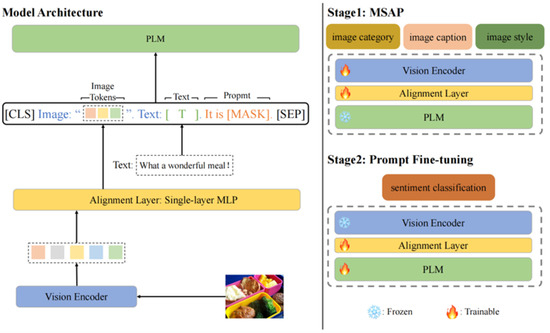 Specifically, we use a vision encoder to extract visual features and use a simple single-layer MLP as the alignment layer to align visual features with language features. Then, we feed the aligned visual tokens and language tokens into the pre-trained language model. During the Multi-task Supervised Alignment Pre-training (MSAP) stage, we first select three large image datasets, each annotated for different tasks. Combining these datasets, we created a massive comprehensive dataset containing approximately 900,000 images. As shown in Figure 1, our strategy is to fix the pre-trained language model (PLM) and update the weights of the visual encoder and alignment layer. Through the transformation of diverse visual tasks—encompassing image classification, image style recognition, and image captioning—into a unified Masked Language Modeling (MLM) paradigm, we achieve a synergistic integration of supervised pre-training and multi-task learning methodologies. Doing so not only improves the overall learning effect through the complementarity of each task but also allows the visual features to obtain richer semantic information. In the prompt fine-tuning stage, we fix the visual encoder and fine-tune the PLM with prompts to complete the FMSA task. Specifically, we make full use of the visual features with rich semantic information and modality sharing information obtained in the first stage through pre-training techniques. We use these features for lightweight and efficient parameter fine-tuning, successfully increasing the training efficiency while ensuring the predictive effect.