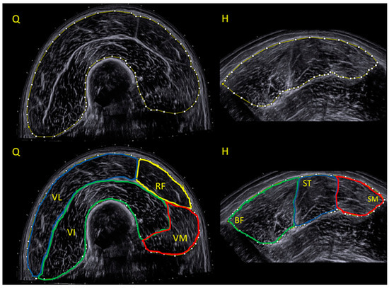 - Kellis, E.; Sahinis, C.; Dafkou, K.; Ellinoudis, A.; Galanis, N. Hamstring to quadriceps strength ratio and cross-sectional area of the quadriceps and hamstrings muscles assessed using extended field-of-view ultrasonography. Res. Sports Med. 2021, 29, 25–42. [Google Scholar] [CrossRef] [PubMed]