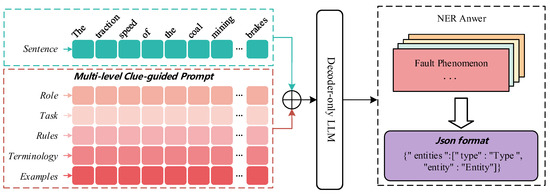 To address the above issues, this paper proposes a multi-level clue-guided prompt learning (MCP) method for NER in the shearer maintenance domain, as illustrated in Figure 1d. This method inputs the information to be identified into the MCP model, where the prompt learning layer encapsulates the information and multiple sub-prompts into structured prompts according to a predefined format. The connection of the structured prompts and the information to be identified is then fed into the LLM layer, which processes it through multiple stacked decoder layers for deep representation learning. The answer layer uses a parser to map the output of the LLM layer into a structured label space, yielding the recognition results for named entities in the shearer maintenance domain. The model extracts and learns trigger words related to entity recognition from the prompts to obtain context-aware prompt tokens. This enables the model to make accurate predictions without relying on fine-tuning with labeled data, while also reducing hallucination phenomena in the LLMs.