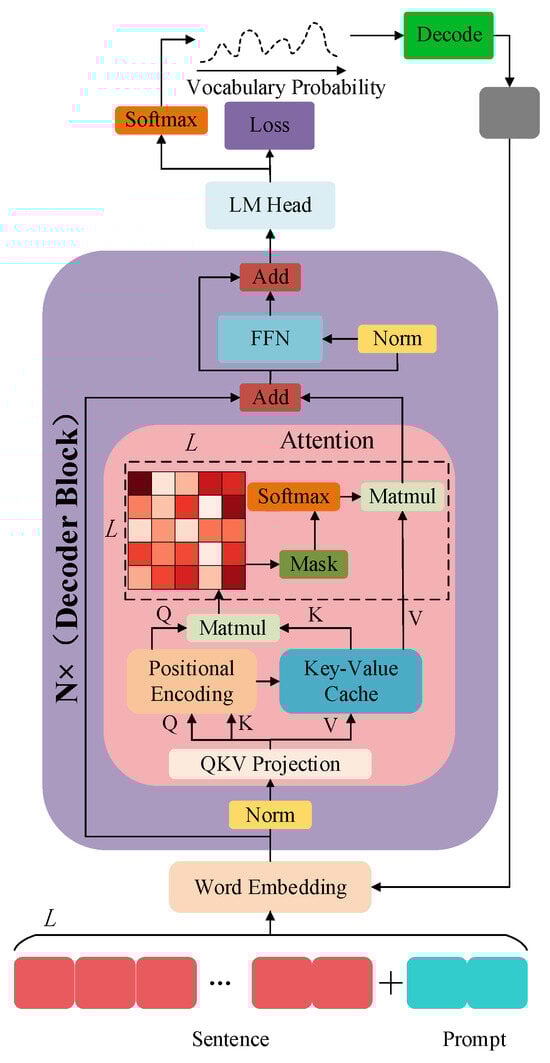 The attention mechanism is a core design component of LLMs based on the decoder-only architecture, implemented in the masked MHA layer [40]. As shown in Figure 4, the original sentence S concatenated with the structured prompt serves as the input to the LLM, with a total length of L. At this stage, the token sequence of word embeddings is represented as , generating three embedding matrices: query , key , and value through the linear projection layer. The model illustrated in the diagram employs relative positional encoding (e.g., rotary position embedding, RoPE [41]). RoPE primarily applies to Q and K to influence attention computation. The V does not require positional encoding, as it only participates in the weighted sum and does not directly impact attention weight calculation. RoPE modifies Q and K via rotational transformation, allowing attention weights to capture relative positional information. Since V is only used for weighted summation, it does not require additional positional information.