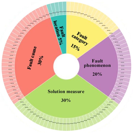 Given the lack of sufficient annotated corpora in the shearer maintenance domain, this study independently constructed a dataset for this domain by collecting manuals, maintenance guides, and repair case studies for various shearer models. Content that did not meet quality and relevance criteria was removed, while the original format and expressions of domain-specific materials were preserved. Data in the shearer maintenance domain are characterized by long texts, lack of subjects, frequent use of technical terms, and irregular structures, which add complexity to entity recognition tasks in this field. Data cleaning was conducted by removing formatting issues and garbled characters. Subsequently, format standardization was performed to convert documents of various formats into a unified text format (e.g., plain text or HTML). The text was segmented, non-ASCII characters were removed, and encoding was standardized. Noise reduction was then applied to the text, which included removing spaces, special symbols, and meaningless short sentences, and using spell-check and correction tools to rectify typos. Finally, missing knowledge was supplemented or relevant additional information was provided to refine the meaning of textual expressions. The dataset for the shearer maintenance domain was constructed using the BIO tagging method. The dataset contained a total of 1092 sentences and 2158 entities, with 80% of the dataset randomly selected for baseline model training and the remaining 20% used for model testing. The distribution of entity types is shown in Figure 5.