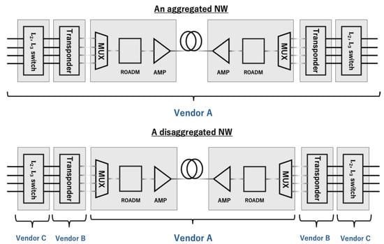 On the other hand, to reduce equipment costs, there is a strong trend toward network disaggregation [5,6,7]. As shown in Figure 1, disaggregation refers to the openness of network equipment. Traditionally, as shown in this figure under the term “aggregated network”, all network components are typically supplied by a single vendor. In contrast, the disaggregated approach allows for the selection of individual components from a variety of vendors. This shift encourages price competition among vendors, leading to potential reductions in CAPital EXpenditures (CAPEX) over time. Such devices are called WhiteBox, since we can see the inside of the box. From an OPerational EXpenditure (OPEX) perspective, the aggregated approach offers a significant advantage in terms of clear accountability for network failures, such as transponder malfunctions. In an aggregated setup, the vendor responsible for providing the network components assumes full responsibility for resolving failures and restoring normal operations. In contrast, the disaggregated approach involves components sourced from multiple vendors, which can introduce ambiguity when diagnosing failures that occur between components, such as an issue involving Component A from Vendor A and Component B from Vendor B. In such cases, identifying the root cause of the failure and determining accountability can become a complex and time-consuming task.