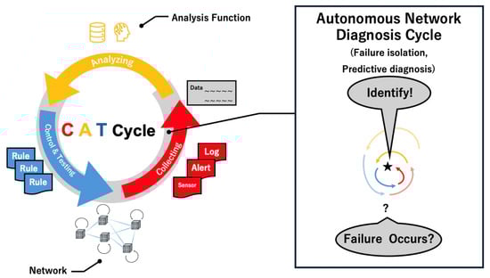For autonomous network diagnosis, we proposed a (Collecting, Analyzing, and Testing) CAT platform for autonomous network diagnosis, as shown in Figure 2. The CAT platform autonomously performs network diagnosis by executing iterative diagnostic cycles without human intervention. In each cycle, it collects various types of information, such as logs, alerts, and sensor data, analyzes the collected data to identify potential issues, conducts further tests based on the analysis results, and then gathers additional information. This process is repeated until the root cause of the issue is identified, ensuring efficient and accurate network diagnosis [11,12,13]. When human operators face some ambiguous situation (question marks in the figure), they will arrange additional tests to further dig into toward final cause. The analyzing (yellow arrow) and testing blocks (blue arrow) generates additional tests to diagnose as the next step as shown in the figure. When they got additional results, but could not reach the final cause, then they will generate further additional tests to clarify cause. This cyclic testing continues until it gets final cause of corresponding faults (star marks in the figure).