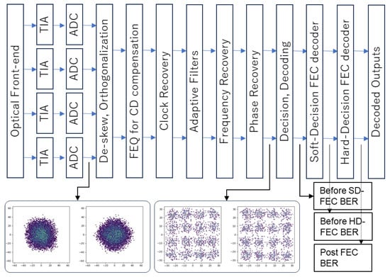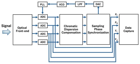 For instance, chromatic dispersion can be compensated for using finite impulse response (FIR) filters applied in either the time domain or the frequency domain. Similarly, polarization mode dispersion can be mitigated using adaptive butterfly-type filters, which dynamically update their tap coefficients to address variations. However, from the perspective of detecting various impairments, such robust signal processing techniques may pose issues. This demodulation operation will erase the information contained in the received optical signal. Thus, we propose a novel approach where we tap digital signals just after ADC in optical receivers, as shown in Figure 3 [24].
