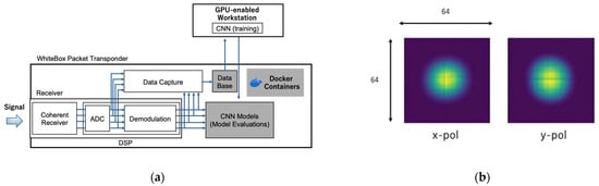 The Cassini WhiteBox is a versatile platform capable of hosting various container-based applications tailored for different purposes, such as data collection and information monitoring, as outlined in [25]. The tapped digital waveform data are temporarily stored in a database container application implemented in Cassini. For machine learning purposes, we accumulated the sampled digital data, consisting of I/Q components, over a fixed timeframe. From these data, we generated 2D histograms with a resolution of 64 × 64 for each polarization (X and Y), as shown Figure 8b. This histogram represents a heat map, with the green area in the center showing higher frequencies.