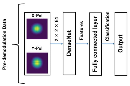 The structure of the CNN model used for optical filter shift detection is shown in Figure 11. The dataset sizes for the constellation data, both before and after demodulation, are configured as 64 × 64. Since there are two polarizations (X and Y), the input data for the CNN model are represented as a three-dimensional tensor with the dimensions 2 × 64 × 64. This structure is depicted in the accompanying figure, where each polarization contributes its own 64 × 64 grid of constellation points to form the input layer. This design enables the model to process and learn from both polarization components simultaneously, improving its performance in analyzing and detecting impairments in optical signals. After the input layer, those data are input into DenseNet [29] (DenseNet 121) implemented by PyTorch. Finally, classification values are obtained through the fully connected layer. In this experiment, the magnitude of the filter shift was divided into two cases: the first filter shift is large (51 GHz) and the second filter shift is small (26 GHz). Accumulation and Min–Max normalization were performed on the captured data.