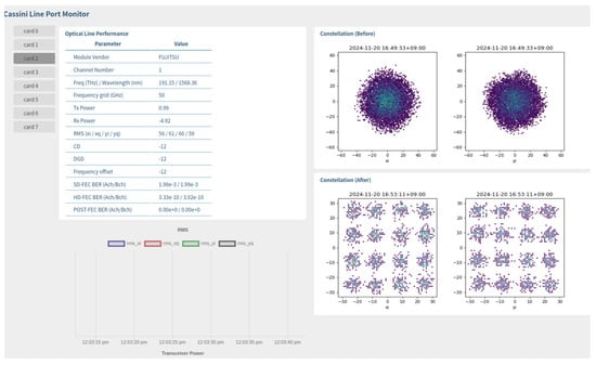 We utilized Python and PyTorch as the primary machine learning platform and library for developing and training the models. The Docker containers hosting these components were centrally managed using the Kubernetes orchestration tool. For real-time monitoring of various parameters within the Cassini system, a dedicated webserver container was implemented. This container allows for real-time telemetry and visualization of critical metrics such as transmitter (Tx) and receiver (Rx) power, bit error rate (BER), and the pre-/post-demodulation constellations. A snapshot of the telemetry interface is shown in Figure 12. Additionally, Kubernetes ensures high availability and fault tolerance. If any container encounters an issue and becomes non-operational, Kubernetes automatically detects the failure and restarts or recovers the container, maintaining the system’s overall functionality and reliability. This robust orchestration capability significantly enhances the resilience and manageability of the system.