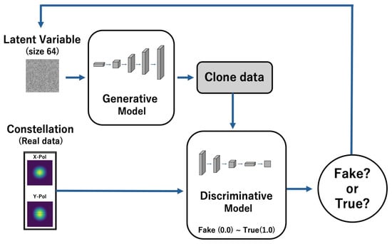 We evaluated the detection performance by adding constellation data reproduced by the DC-GAN. For data augmentation, a DC-GAN-generated model is created with reference to a model created by using only measured constellation data. The model diagram of the DC-GAN for this experiment is shown in Figure 13. In addition, the DC-GAN training parameters used in this experiment are shown in Table 2 below.