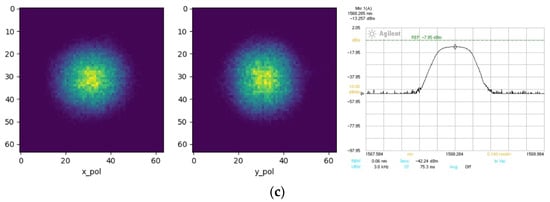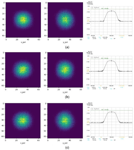 Figure 14 and Figure 15 show the shape of the optical spectrum for each condition and constellation histogram (heatmap) obtained at the conditions determined (51 GHz and 26 GHz). Three labels are assigned for each condition: ‘left shift’ for the negative frequency shift, ‘right shift’ for the positive frequency shift, and ‘normal’ for optimum. The optical spectra for the above conditions were acquired using an optical spectrum analyzer. At 51 GHz shift, we can observe a small tilt in each spectrum. On the other hand, at 26 GHz shift, a very slight slope is observed compared to that at 51 GHz.