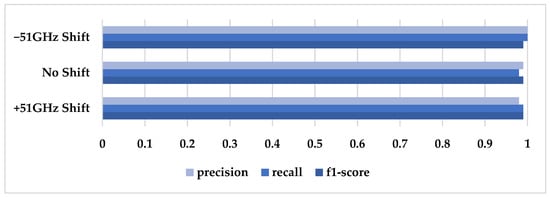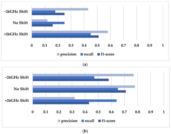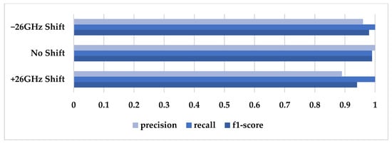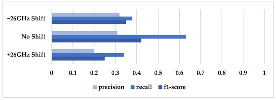 Figure 18 shows the evaluation results at the 26 GHz shift without augmentation. The number of training data points used was 13,000 for each label. The number was almost the same as the one used for detection at the 51 GHz shift.