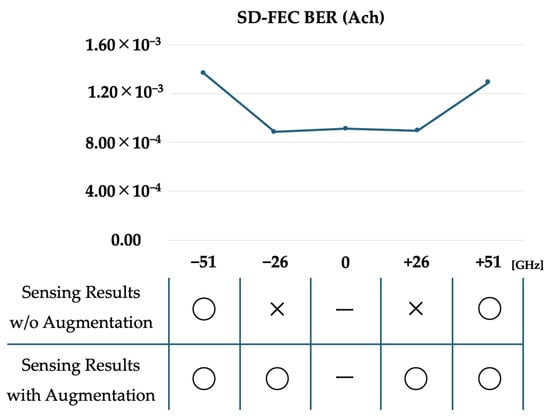 The summary results of simultaneous monitoring of BERs and DC-GAN-enhanced optical filter shift detection are shown in Figure 22. The SD-FEC BER for each optical filter shift stayed stable when the optical filter shift was within 26 GHz and showed a significant increase at ±51 GHz. As for optical filter shift detection, we successfully detected it at as small as ±26 GHz, where we there was no sign of abnormality in the BER. The BER is a fundamental measure for transmission quality; so, we can say that network services work well and in a normal state when there is no BER increase. In other words, the proposed technology made it possible to confirm that an optical filter shift had already occurred, even when the optical transmission line was in a completely normal state. The optical filter shift gradually increases with time; so, we can predict that there will be a failure resulting from the optical filter shift in ROADMs in the near future by utilizing the novel DC-GAN-enhanced optical filter shift detection. To realize a practical prediction system based on this idea, one of the options may be to accumulate and prepare sufficient data of temporal drift of the central optical frequency in ROADM nodes. Based on this information, we can estimate the residual time to encounter the failure. How to estimate the actual time needed to induce ROADM failures will be focused on in further research.