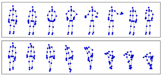 In recent years, human action recognition technology has shown strong momentum in practical applications, gradually being applied in various fields such as real-time monitoring and video retrieval, robotics and industrial automation, and in healthcare applications (patient monitoring, rehabilitation assistance, etc.). These specific real-world applications, especially those on devices with limited computational resources, pose higher demands on the recognition accuracy and computational efficiency of models. Additionally, collaboration between humans and robots has greatly enhanced industrial automation and production efficiency. Among the key technologies of human–robot collaboration, rapidly and effectively perceiving human behavior information is a challenge [1,2,3,4,5]. Deep learning techniques for recognizing actions based on skeleton data have garnered considerable interest due to their resilience in adapting to changing environments [6,7,8]. Figure 1 shows a visualization of the human skeletal sequence.