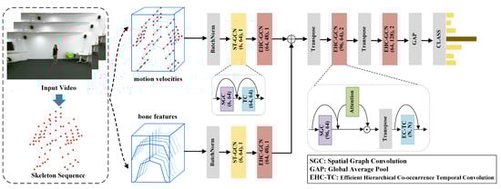 Figure 2 illustrates the structure of the EHC-GCN. Firstly, after data preprocessing, two input branches of identical size are obtained: motion velocity and bone features. Each input sequence can be represented by a tensor of dimensions , where , , and represent the channels, frames, and joints, respectively. These inputs are processed as streams into the network, with each branch sharing the same network architecture. Each input branch includes a BatchNorm layer, an initialization ST-GCN module [7], and the efficient hierarchical co-occurrence Graph Convolution Network (EHC-GCN) module proposed in this paper. The details of the module will be explained in the following subsections. Following the input branches, we integrate the feature maps from the two branches with concatenation operation. The main branch also employs two EHC-GCN modules. Finally, the output feature maps undergo global averaging to create a feature vector, followed by the application of a fully connected layer to classify the action category.