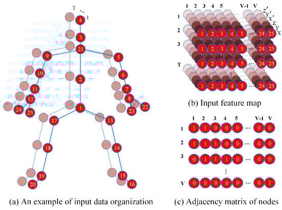 - The different methods of obtaining skeleton data resulted in variations in the number of body joints and their adjacency relationships. When using GCN operations to process skeleton data, it is necessary to customize the adjacency matrix between joints (as shown in Figure 3c). Therefore, when dealing with skeleton data from different sources, it is necessary to reset the adjacency matrix to reflect the current body joint connectivity.