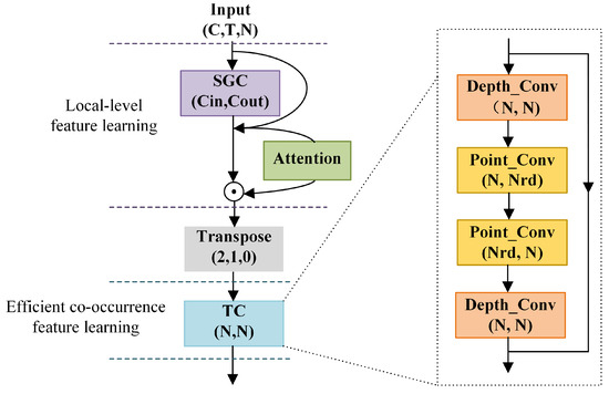 Similar to CNNs, GCN can be seen as the aggregation of local features in the spatial domain of skeleton data and the global feature aggregation across channels. Since it is locally aggregated in space, it may be difficult to capture remote joint interactions involved in actions. As the output of the convolution is the global response of all input channels, if the joint and channel dimensions are transposed, the convolution layer can easily learn the co-occurrence of all joints. Therefore, we adopt a hierarchical co-occurrence framework to adjust the degree of feature aggregation. First, we learn the local features of joint through SGC operations. After transposing the joint and channel dimension, we can use CNN operations to learn the global features of all joints while using convolution kernels to extract temporal features, as shown in Figure 4(left), where and represent the number of input and output channels, respectively, and N represents the total number of body joints.