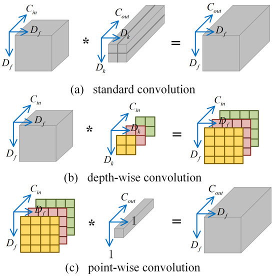 Separable convolution operation consists of two parts: depth-wise convolution (D_Conv) and point-wise convolution (P_Conv). D_Conv is to perform separate group convolution on each input channel. P_Conv employs 1 × 1 convolution kernels to combine the outputs of all channels. A visual comparison of standard and separable convolution is illustrated in Figure 5. Assuming that the dimensions of the input features are , the kernel dimensions are , and the counts of input and output channels are and , respectively, the computational expense of standard convolution is calculated as , as depicted in Figure 5a. In contrast, for the separable convolution represented in Figure 5b,c, the computational requirement is represented as . It can be seen that replacing standard convolution with separable convolution layers can effectively reduce the computational cost of the model.