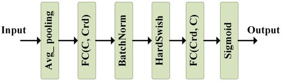 The hierarchical co-occurrence framework can effectively extract the local and global information of joint features, implicitly incorporating an attention mechanism in the joint dimension. To further consider the relationships between channel features, this paper implements an attention module based on the SENet [34] structure to automatically learn the importance of each channel feature. As shown in Figure 6, the spatial dimensions are first compressed through an adaptive average pooling operation to obtain a global receptive field. Then, the channels are dimensionally reduced and expanded through fully connected (FC) layers, which is performed to apply nonlinear transformations to the network and reduce the computational load. Finally, the obtained scores for each channel are applied to the corresponding channels through a multiplicative weighting process.