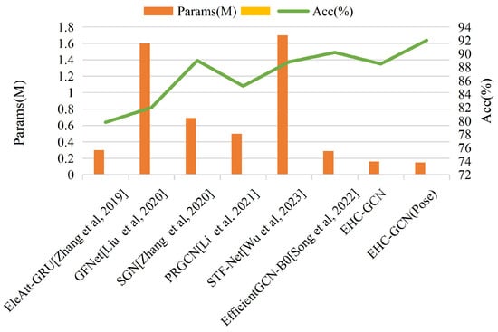 In particular, we focus on several lightweight action recognition models [22,28,29,30,31,44,45], which are indicated with an asterisk (*) in Table 6 and Table 7. Figure 7 shows the Params (M) and accuracy (%) for different lightweight models. The horizontal axis lists the names of different models; the left side of the vertical axis displays the Params (M), represented by an orange bar chart; the right side of the vertical axis shows the accuracy (%), represented by a green line graph. It can be observed that, compared to EleAtt-GRU [44], GFNet [45], and PRGCN [22], our model achieves higher accuracy with fewer parameters. Compared to the SGN method [28], our approach has slightly lower accuracy on the NTU 60 dataset but performs better on the NTU 120 dataset with fewer parameters. Compared to the most advanced lightweight models (CoST-GCN, CoAGCN, and CoS-TR [30]), our model achieves similar performance with fewer parameters. It is worth noting that this algorithm provides a frame-by-frame prediction approach, which significantly reduces its FLOPs, whereas our method and other comparative algorithms operate on the entire skeleton sequence. The accuracy of the EfficientGCN-B0 model [29] is higher than our method, but we can achieve slightly higher accuracy on the NTU 120 dataset X-Set benchmark, and with fewer parameters and lower computational complexity. Moreover, in 2D skeleton-based action recognition using pose estimation, our paper achieves superior results in both accuracy and efficiency. In summary, our model has lower requirements for computational resources and demonstrates good performance.