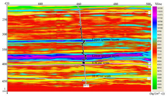 Due to their high acoustic impedance, the igneous layers can be clearly identified from the seismic inversion information in Figure 4. In the profile, the occurrence of coal seams is represented in green, while that of the igneous layers is represented in purple. The No. 82 and No. 10 coal seams, along with the two igneous layers, are also marked.