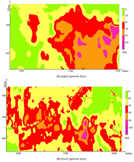 The horizons were picked to calculate the time thicknesses of the igneous layers. The thickness information of the layers was then transformed using the site sampling velocity test and the occurrence range. Subsequently, the thickness distribution of the igneous layers was calculated, as shown in Figure 5. According to the figure, the thickness distribution of the igneous layers is heterogeneous, with the maximum thickness reaching 100 m. Moreover, the lower igneous layer is more widely distributed than the upper one.