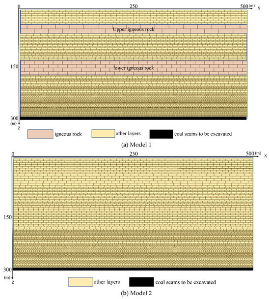 Based on the geological conditions and mechanical parameters of the strata (as shown in Table 1), two models were constructed. In accordance with the actual conditions of the Huaibei Coalfield described in Section 3.2, Model 1 was designed to include two igneous layers: a lower layer with a thickness of 45 m and an upper layer with a thickness of 25 m. In contrast, Model 2 did not have any igneous layer occurrences, as depicted in Figure 6. For the purpose of comparison, the length and height of both models were set to 600 m and 300 m, respectively. Vertical stress of 7.5 MPa was applied to the top of each model to simulate the overlying strata. According to the coal mining design, 50 m wide protective coal pillars were reserved on the left and right sides of the model. The mining height of the coal face was set at 4.0 m, and the excavation length was 500 m. Five survey lines were arranged within the models, and the strata lithology at the locations of these lines is presented in Table 2.