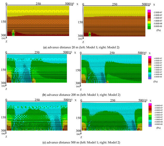 In Model 2, an evident vertical stress concentration was present in the surrounding rock close to the goaf. As the coal face progressed, both the peak value of the vertical pressure and the range of its advanced influence kept increasing. In this case, the maximum vertical stress at the coal face reached 35.6 MPa, and the maximum advanced influence range measured 29.6 m. Therefore, compared to Model 2, in Model 1, apart from the goaf, vertical stress concentration also took place in the igneous layer, and it exhibited a more extensive advanced influence range.