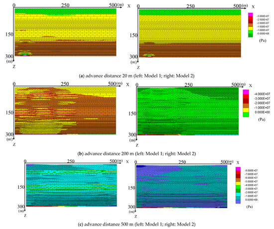 The simulation results of the horizontal stress are presented in Figure 8. These revealed a progressive evolution of stress distribution patterns during coal face advancement. In the initial stage (20 m advancement in Model 1), a localized horizontal stress concentration zone emerged within the lower igneous rock stratum. As the advance distance increased, distinct stress concentration phenomena developed simultaneously in both igneous layers, accompanied by the formation of an igneous abscission layer at approximately 200 m of face advancement. Ultimately, when the coal face reached the maximum advance distance of 500 m, extensive stress concentration areas were established throughout both the upper and lower igneous rock strata, indicating a complete redistribution of the stress field.