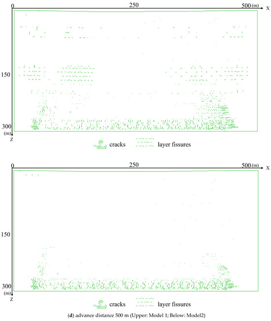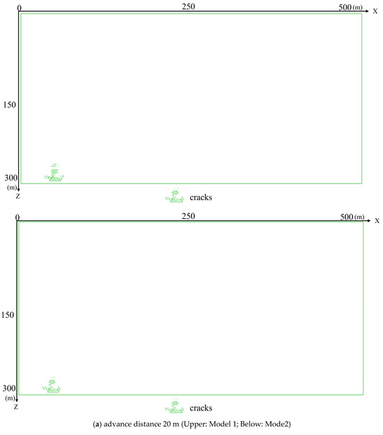 The simulation results of the development of the roof abscission layer are presented in Figure 9. In Model 1, when the advancing distance reached approximately 20 m, transverse cracks emerged above the roof. As the advancing distance increased, axial cracks appeared in front of the coal face and behind the open–off cut. When the coal face advanced about 100 m, fissures of the roof abscission layer began to develop in the lower igneous layer. Subsequently, the fissures in the lower igneous layer further propagated and expanded. When the coal face advanced approximately 200 m, fissures started to emerge in the local area of the upper igneous layer. At this point, the abscission layer gradually formed in the two igneous layers. Finally, after the full mining of the coal face, the maximum development height of the water-conducting fracture was 142.4 m, which was about 35.6 times the mining thickness.