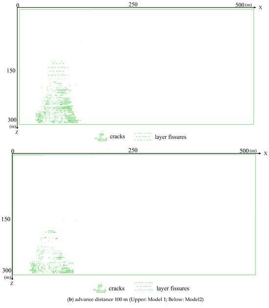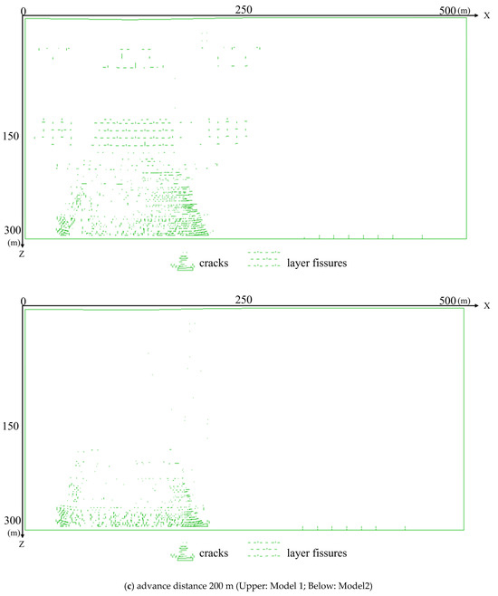 In Model 2, transverse cracks emerged above the roof when the advance distance was approximately 20 m. As the advance distance increased, axial cracks manifested in front of the coal face and behind the open–off cut. Once the coal face had advanced 200 m, the abscission layer fissures in the middle of the goaf gradually underwent compaction and closure. At this stage, the water-conducting fissures were only developed in the vicinity of the open–off cut and the coal face. The maximum fracture development height measured 90.4 m, which was roughly 22.6 times the mining thickness. Consequently, compared with Model 2, in Model 1, the abscission layer formed within the igneous layers, and the height of the water-conducting fracture was greater.