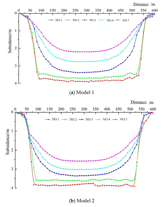 Figure 10 presents the strata subsidence data of the two models, which was recorded by the survey lines. As depicted in the figure, the maximum subsidence values of the lower igneous layer and the upper igneous layer, as recorded by line 4 and line 5, respectively, were approximately 2.78 m and 2.21 m in Model 1. In contrast, in Model 2, the subsidence of the igneous layers was about 3.03 m and 2.58 m. This indicates that the rock subsidence in Model 1 decreased by 8.25% and 14.34%, respectively, compared to Model 2. However, the law of subsidence variation in other strata, as recorded by line 1, line 2, and line 3, was nearly identical. Thus, it can be concluded that the igneous rock within the overburden exerted a certain degree of controlling influence on the subsidence of the upper strata.